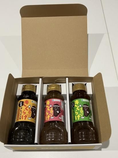 ゴロッときくらげドレッシングの和風味、梅味、韓国風チョレギ味と3種類の味が楽しめる3本セットです。