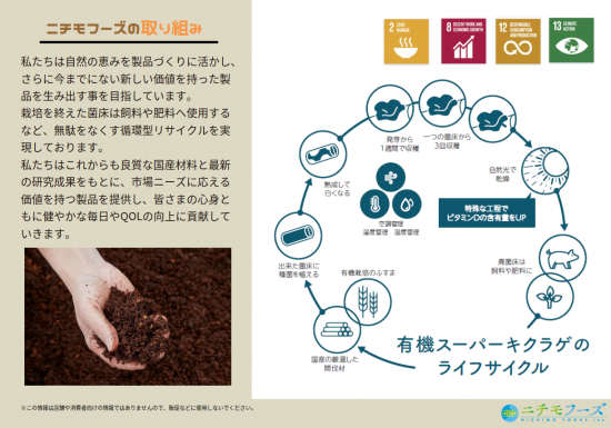 弊社はSDGsへの取り組みの一環としてロスを無くす、廃棄を無くすという観点から廃菌床を活用した肥料づくり飼料づくりに取り組んでいます。